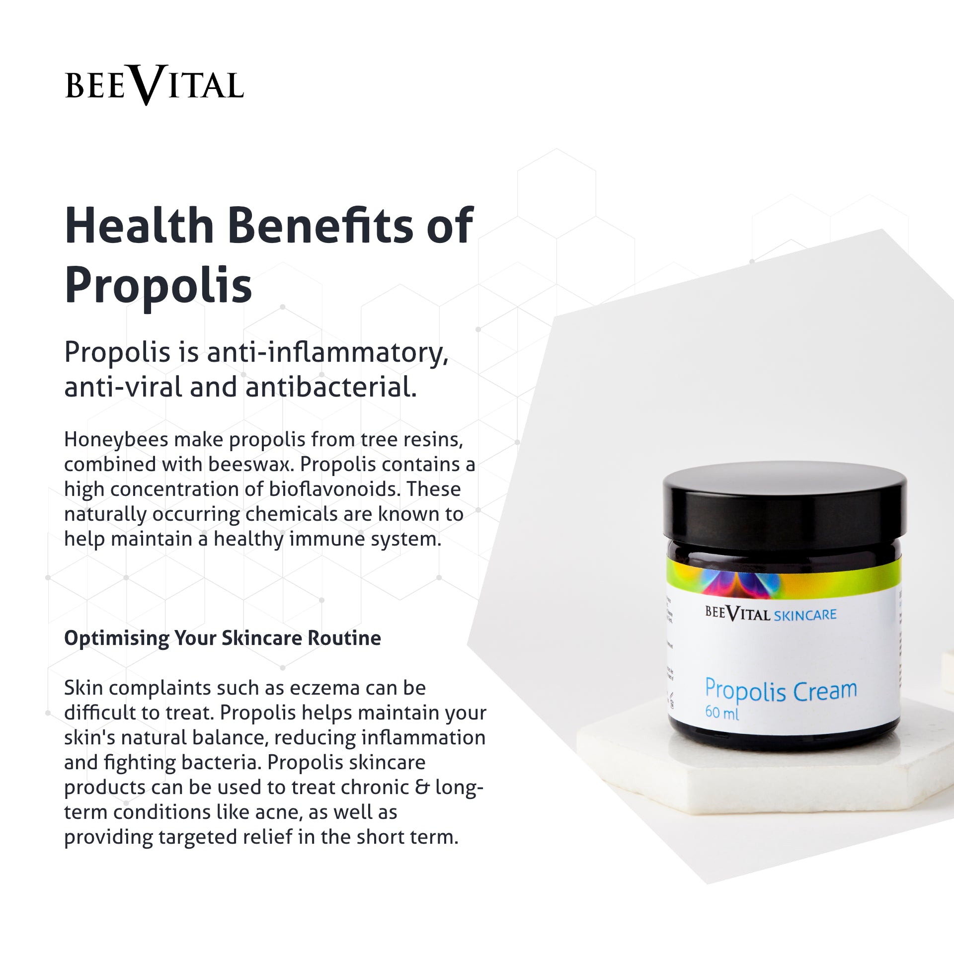Propolis Cream is combines the natural healing properties of propolis with a paraben-free base cream. Propolis is naturally antibacterial, anti-inflammatory and antiseptic, which is great news for skin!